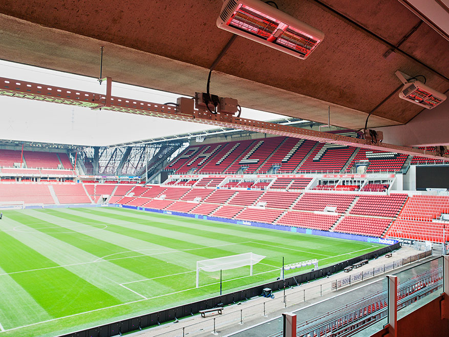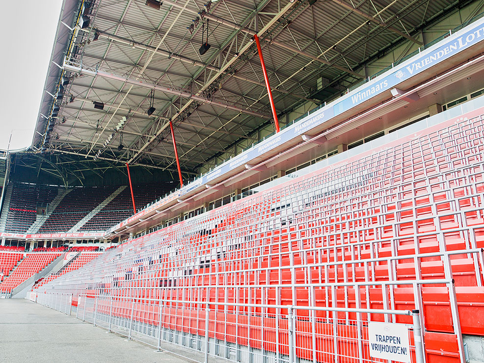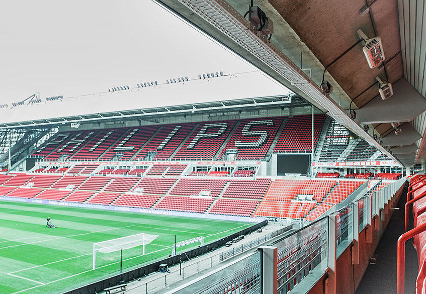 PSV Eindhoven wollte zusätzlich LED Werbeschilder auf der zweiten Ebene des Stadions befestigen. Auch hier sorgen die Kabelrinnen RKS-Magic® in der Fabre RAL 9010 für eine sichere und zuverlässige Stromversorgung.