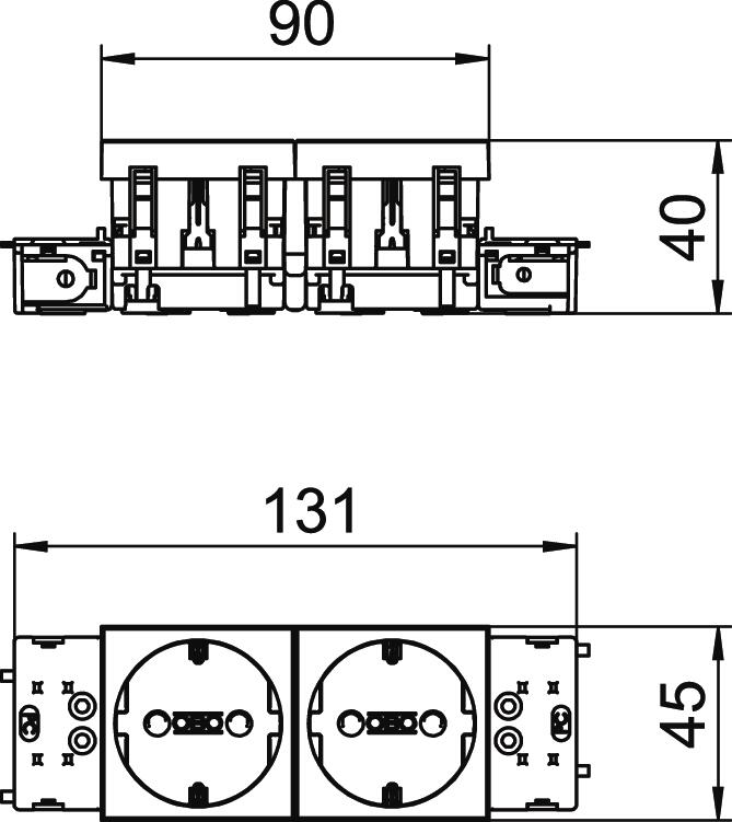 Opis produktuGniazdo zasilające z bocznym podłączeniem podwójne, 0°, z podwyższoną ochroną przed dotykiem, z szybkozłączkami, 2-polowe, 16 A, 250 V~, z zaciskami połączeniowymi wg IEC 60884-1, do zastosowania w kanałach podparapetowych Rapid 45.