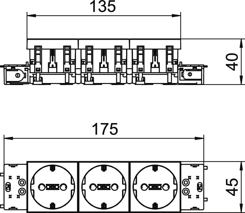 Opis produktuGniazdo zasilające z bocznym podłączeniem potrójne, 0°, z podwyższoną ochroną przed dotykiem, z szybkozłączkami, 2-polowe, 16 A, 250 V~, z zaciskami połączeniowymi wg IEC 60884-1, do zastosowania w kanałach podparapetowych Rapid 45.