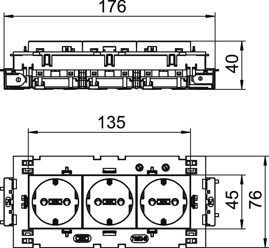 Opis produktuGniazdo zasilające z bocznym podłączeniem potrójne, 0°, z podwyższoną ochroną przed dotykiem, z szybkozłączkami, 2-polowe, 16 A, 250 V~, z zaciskami połączeniowymi wg IEC 60884-1, do zastosowania w kanałach podparapetowych Rapid 80.