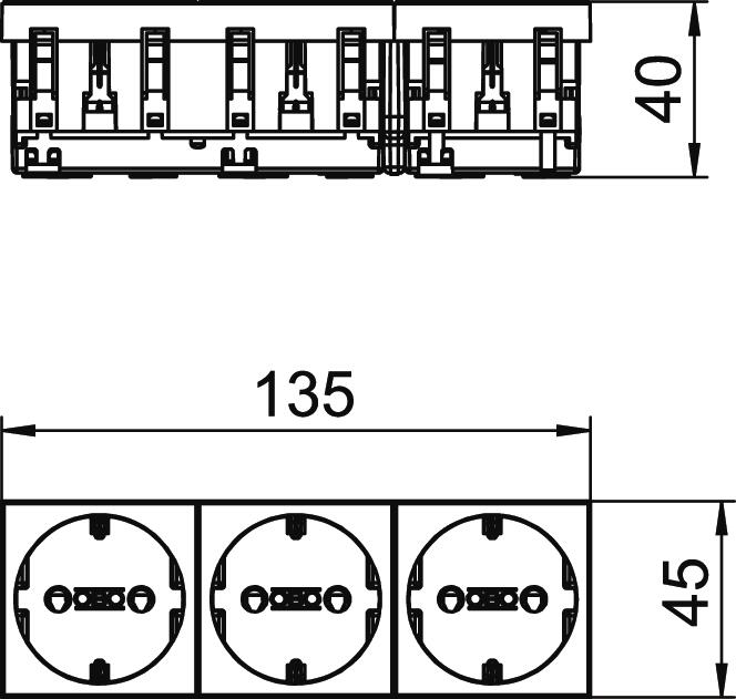 Opis produktuGniazdo zasilające potrójne, 0°, z podwyższoną ochroną przed dotykiem, z szybkozłączkami, 2-polowe, 16 A, 250 V~, z zaciskami połączeniowymi wg IEC 60884-1.