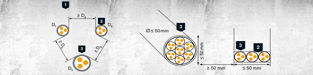 Jeśli przez ognioodporne elementy konstrukcyjne są przeprowadzane jedynie pojedyncze przewody lub małe wiązki kablowe, można je ułożyć w pojedynczych otworach, z odpowiednimi odstępami względem siebie. Pojedyncze otwory muszą być zamknięte materiałami spieniającymi się w razie pożaru lub mineralnymi. Największa średnica zewnętrzna wyznacza przy tym odstęp od mniejszych przewodów. Dzięki temu nie wzrasta ryzyko rozprzestrzeniania się pożaru. Pojedyncze kable bez ograniczenia średnicy są dopuszczalne bez przegród – wystarczy uszczelnienie pierścieniowe wokół kabla.