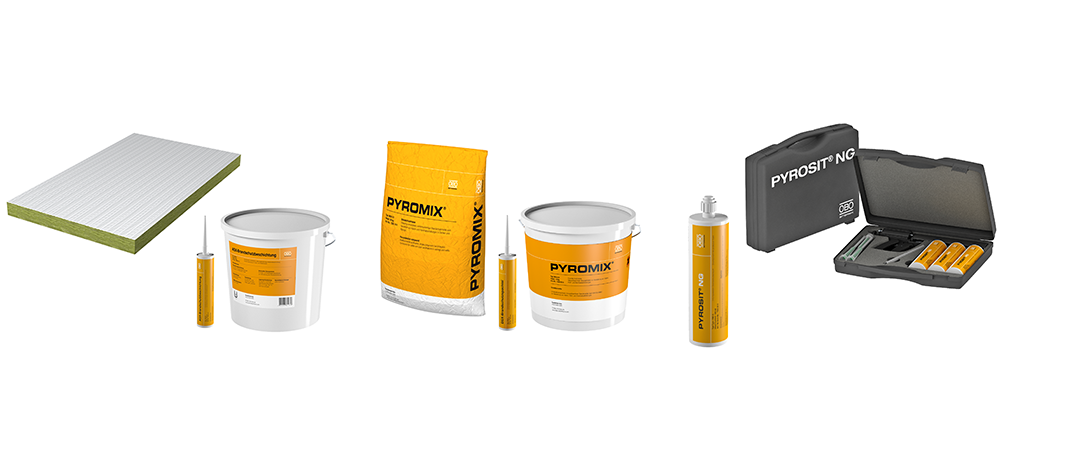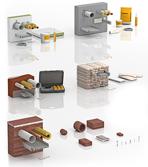 Zaprawy specjalne, powlekane płyty z włókien mineralnych, pianka ognioodporna, masy 1-składnikowe, pianki, łączniki kształtowe, skrzynki, silikon i specjalne gumowate moduły. Wszystkie systemy posiadają specjalne części i dodatki odporne na ogień, które w razie pożaru zapewniają bezpieczne działanie zgodnie z normą kontrolną.