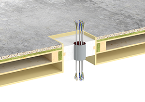Przegrody należy zamontować również w podłogach systemowych – podłogach technicznych i podniesionych. Jeśli kanały podpodłogowe biegną pod murami z klasą odporności ogniowej, należy zastosować środki izolacyjne. Kanały podpodłogowe pokryte wylewką są izolowane począwszy od najbliższych puszek podpodłogowych, otwór w ścianie nie jest bezpośrednio dostępny z powodu wylanego jastrychu. Odstępy między puszkami podpodłogowymi nie są przy tym ważne. Istotne jest gazoszczelne i ognioodporne zamknięcie, zapobiegające rozprzestrzenianiu się ognia.
