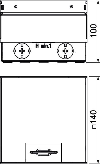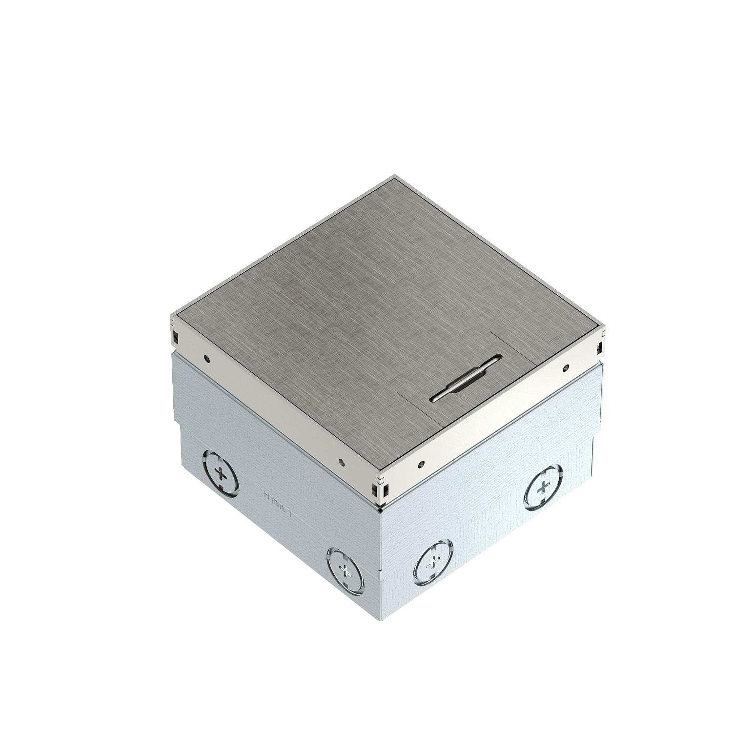 Kwadratowa kaseta zasilająca do montażu w podłogach technicznych i wylewkach czyszczonych na sucho. Obudowa montażowa z wejściami do wprowadzania peszli (M20/M25). Pokrywa licowana do górnej krawędzi podłogi za pomocą 4 wsporników regulujących. Minimalna głębokość montażowa 100 mm, zakres regulacji + 35 mm.
