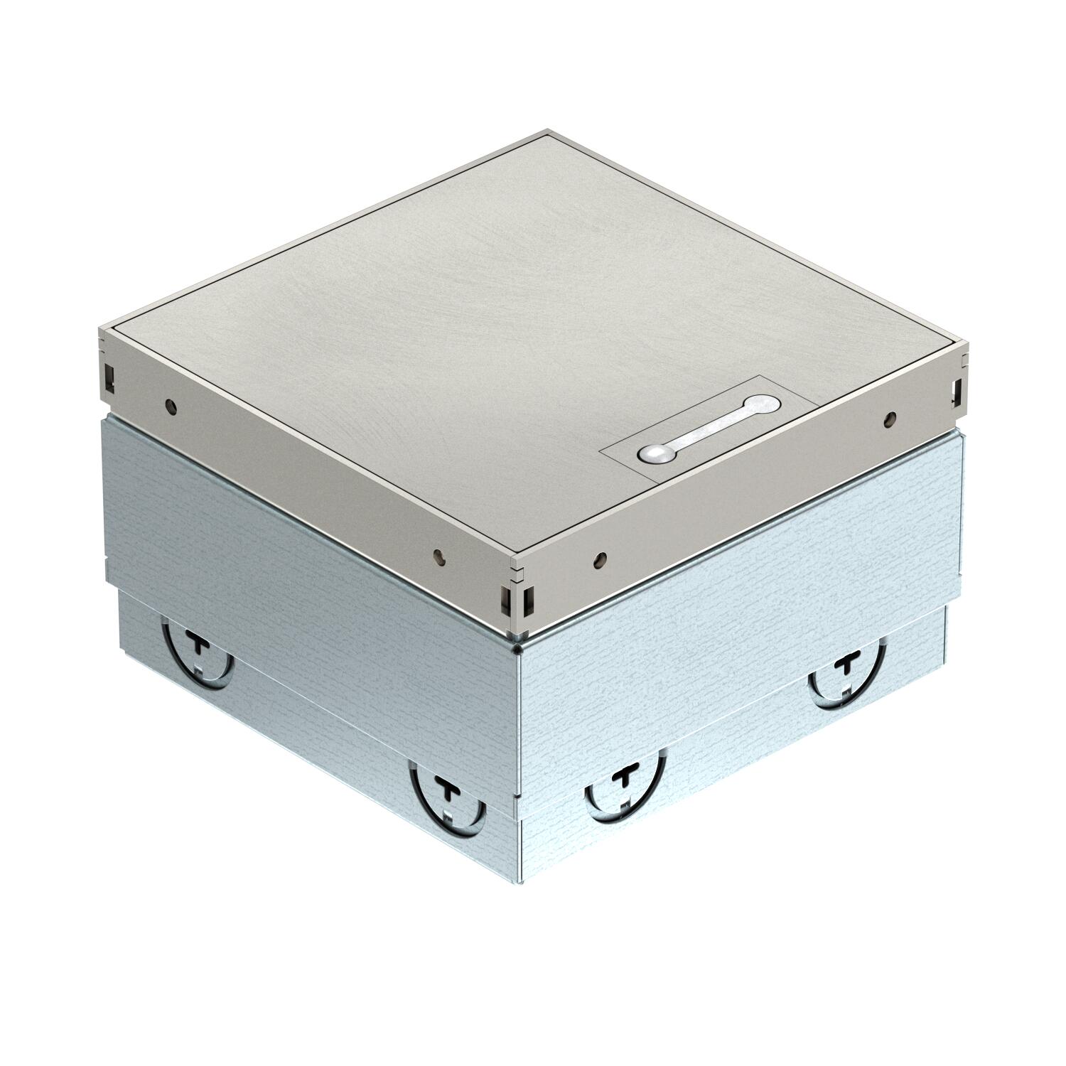 Opis produktuSquare floor socket for use in dry-care cavity and screed floors in indoor areas. Installation housing with pre-marked insertion openings for pipes (M20/M25). Cover adjustable to top edge of floor covering using four height-adjustment supports. The minimum installation depth is 100 mm, the height-adjustment range 35 mm. Frame and cover made of stainless steel and visible in the floor covering. Cover with decorative plate and brush bar for cable routing. Empty housing for up to 2 Modul 45® devices in the mounting support and 2 data sockets in the optional data technology support.